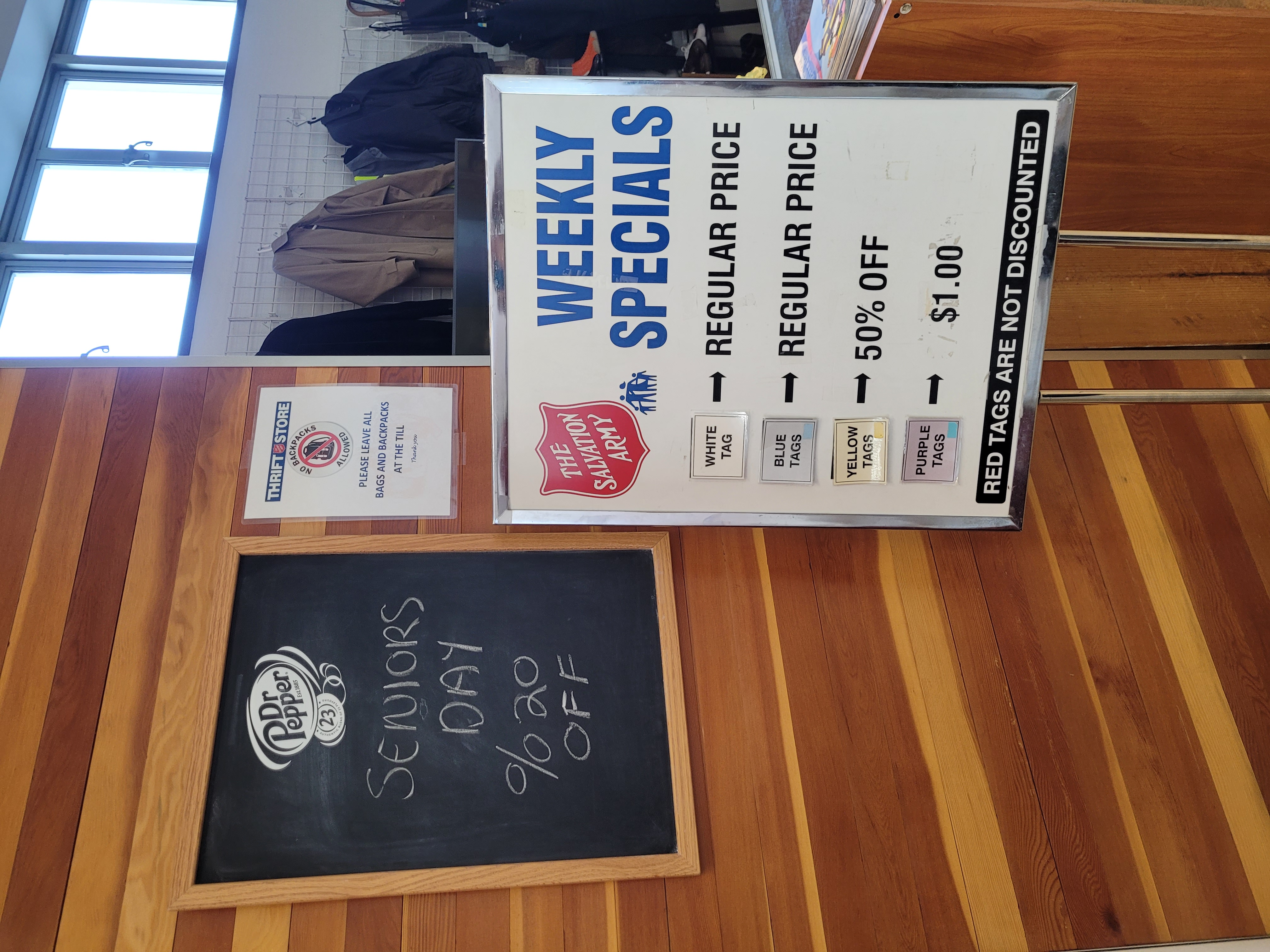 Watch for our Weekly Specials in the Thrift Store! Different colored tags can net you savings, and these are posted on the sign board at the front of the store and posted on our FB page.